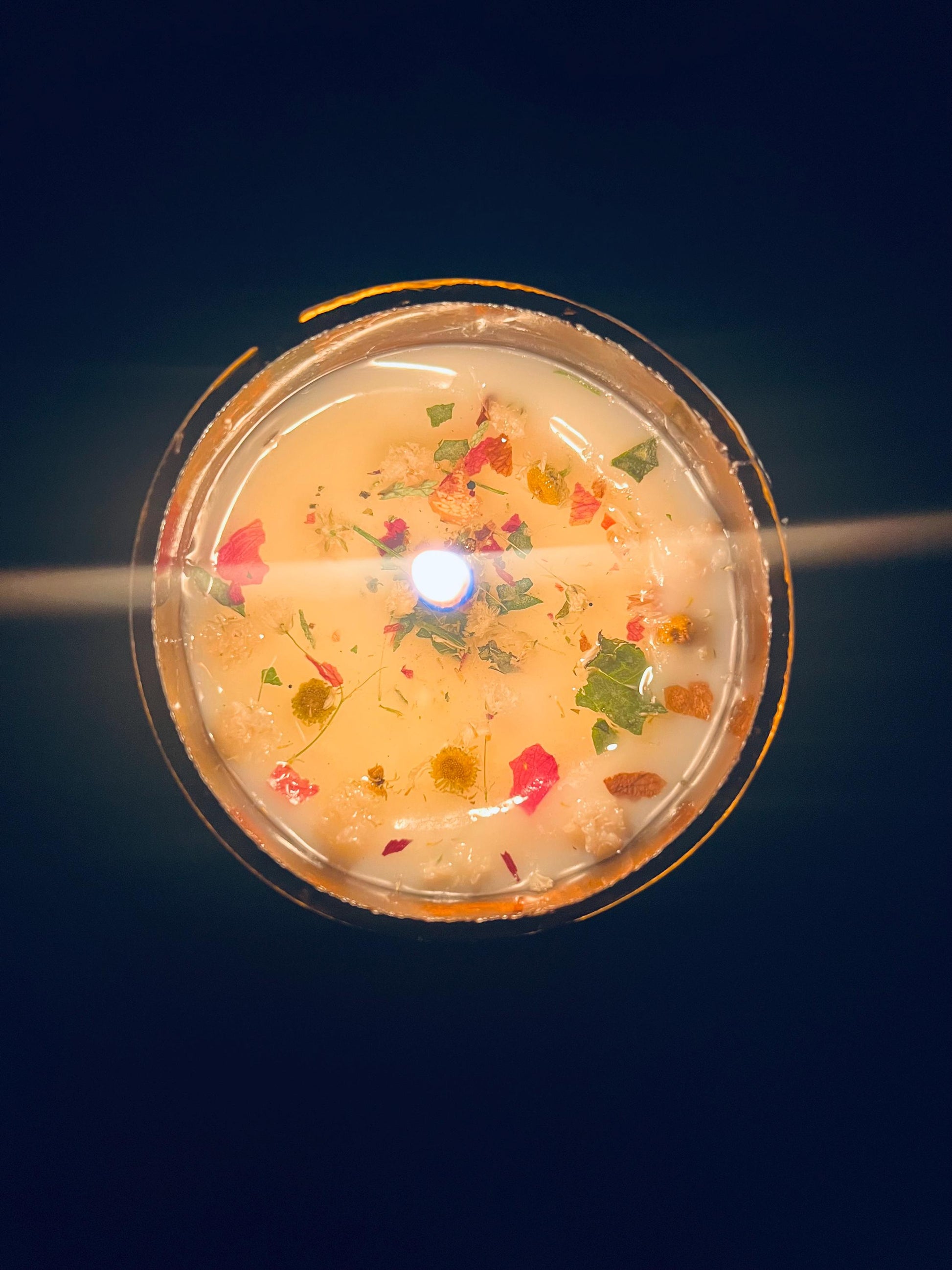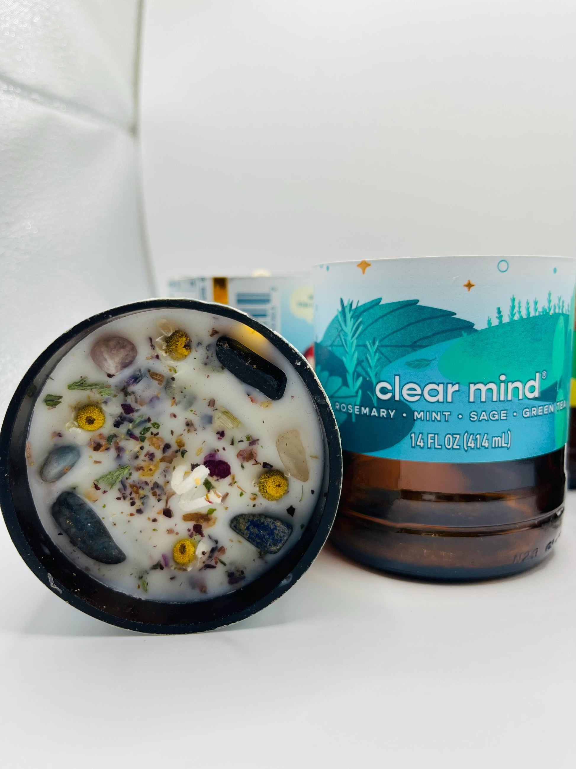 Upcycled Kombucha by Brew Dr. personally enjoyed, and hand cut to morph into their next life. As a fabulous candle, coconut wax and coconut scented. They're dressed in rose petals, varying healing stones, lavender, chamomile and green tea sand. Light, natural, simple and repurposed.
